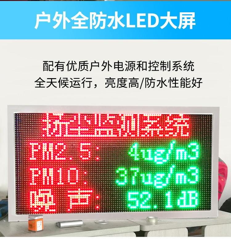 (6)揚(yáng)塵監(jiān)測(cè)設(shè)備采用:戶外全防水LED大屏,配有優(yōu)質(zhì)戶外電源和控制系統(tǒng),全天候運(yùn)行,亮度高/防水性能好。