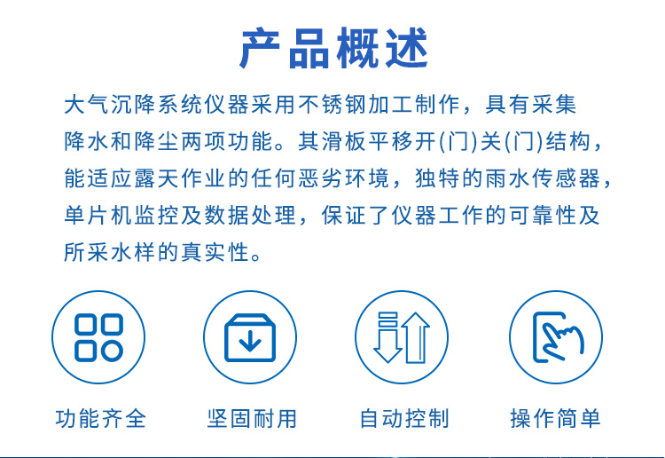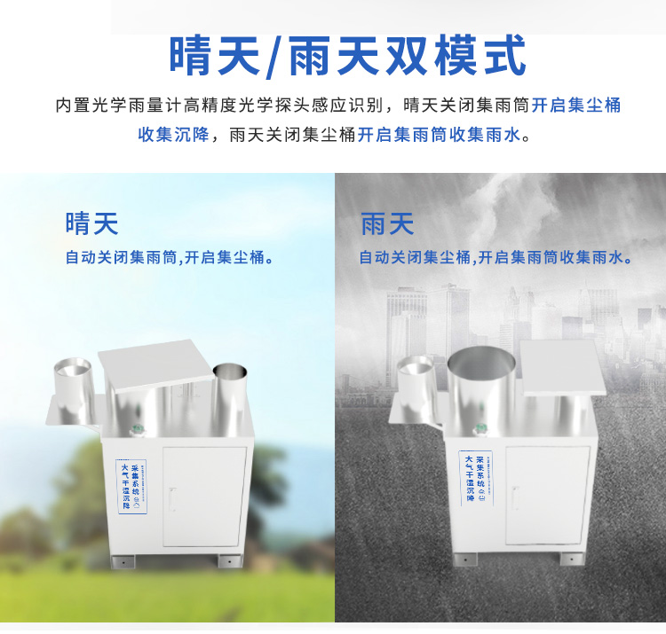 大氣干濕沉降采集系統(tǒng)是主要用來采集并監(jiān)測降水和降塵的大氣污染檢測站。大氣干濕沉降采集系統(tǒng)具有采集降水和降塵兩項功能,支持數(shù)據(jù)在線上傳至終端設(shè)備。采用不銹鋼加工制成,耐空氣、蒸汽、水等弱酸性腐蝕,安裝牢固。其滑板平移開(門)關(guān)(門)結(jié)構(gòu),能適應(yīng)露天作業(yè)的任何惡劣環(huán)境。該空氣沉降傳感器可廣泛應(yīng)用于小區(qū)、公園、農(nóng)業(yè)、科研、氣象局等領(lǐng)域。