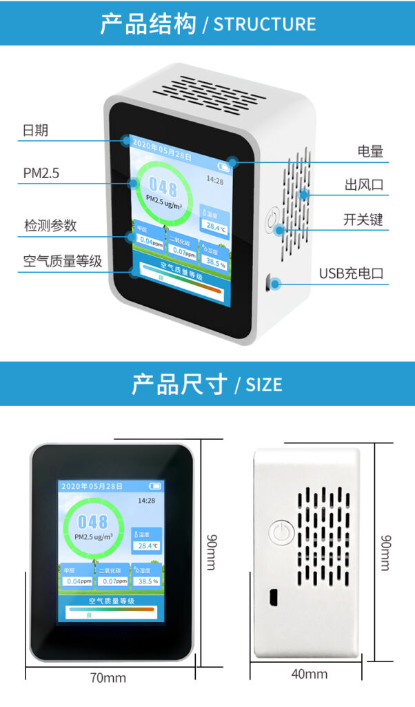 5、2.8寸TFT彩色屏幕,大屏顯示讀取直觀一目了然,空氣質(zhì)量檢測儀實時顯示空氣質(zhì)量狀況,內(nèi)置高精度時鐘模塊。