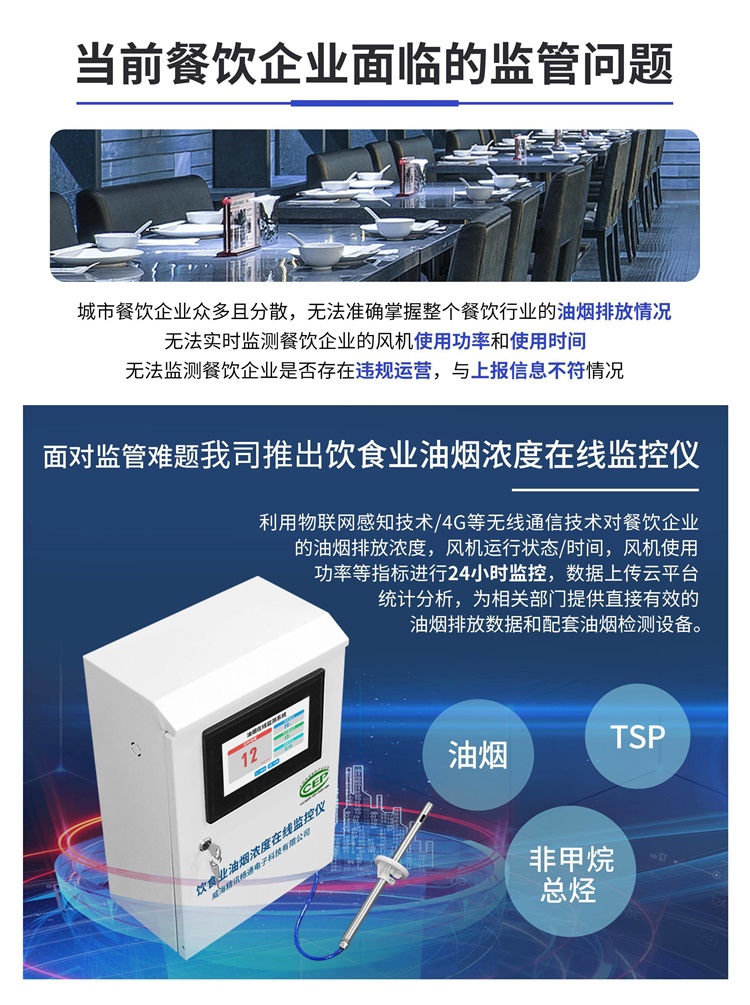 油煙在線監(jiān)測儀,能夠?qū)Σ蛷N排煙管道的油煙濃度、顆粒物濃度、非甲烷總烴(NMHC)濃度進(jìn)行24小時(shí)不間斷測量,并上傳我司免費(fèi)的監(jiān)控平臺或政府監(jiān)控平臺。為了防止商家凈化器或風(fēng)機(jī)不啟動,還可通過電流互感器采集兩路電流信號,監(jiān)控凈化器或風(fēng)機(jī)是否真實(shí)啟動。為方案安裝人員操作,整機(jī)采用7寸電容觸摸屏,全中文界面設(shè)置簡單易懂。主機(jī)帶有1路GPRS(可選4G)通信接口,可插入普通手機(jī)卡或物聯(lián)卡進(jìn)行數(shù)據(jù)上傳,有手機(jī)信號的地方就可以把數(shù)據(jù)上傳出去。
