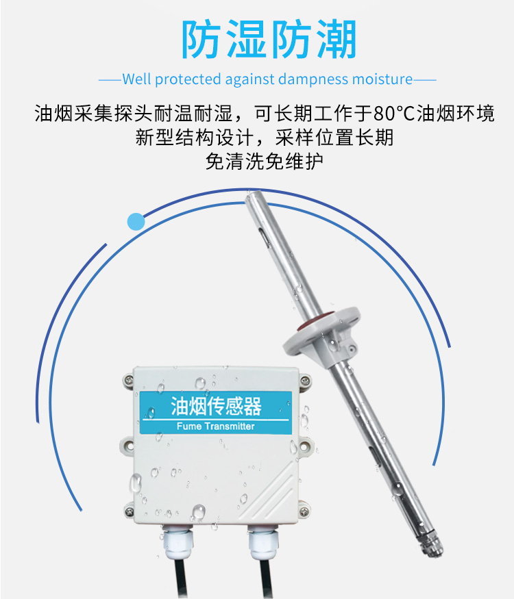 4、防濕防潮:油煙傳感器采集探頭耐溫耐濕,可長期工作于80℃油煙環(huán)境,新型結(jié)構(gòu)設(shè)計(jì),采樣位置長期免清洗免維護(hù);