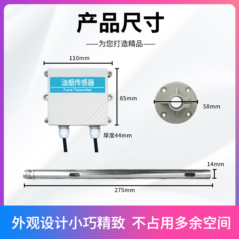 4、防濕防潮:油煙傳感器采集探頭耐溫耐濕,可長期工作于80℃油煙環(huán)境,新型結(jié)構(gòu)設(shè)計(jì),采樣位置長期免清洗免維護(hù);