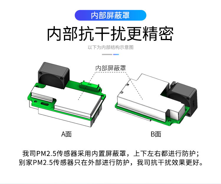 1.粉塵傳感器內(nèi)置屏蔽罩,并采用防積塵風(fēng)道設(shè)計,從各個方向?qū)鞲衅骱诵牟考M(jìn)行防護(hù),相比于只存在簡單外部防護(hù)結(jié)構(gòu)的同類粉塵傳感器,抗干擾能力更強(qiáng),零點漂移小。