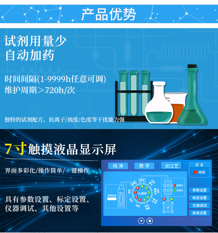 9項(xiàng)水質(zhì)檢測(cè)系統(tǒng)適用于大、中、小型水廠及農(nóng)村用水的濁度余氯、總氯化合氯、二氧化氯色度、嗅和味、細(xì)菌、PH、COD錳的檢測(cè),以便使檢測(cè)的水達(dá)到規(guī)定的水質(zhì)標(biāo)準(zhǔn)。