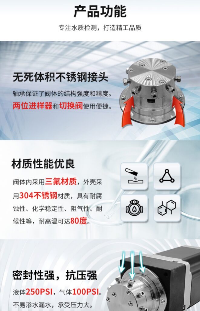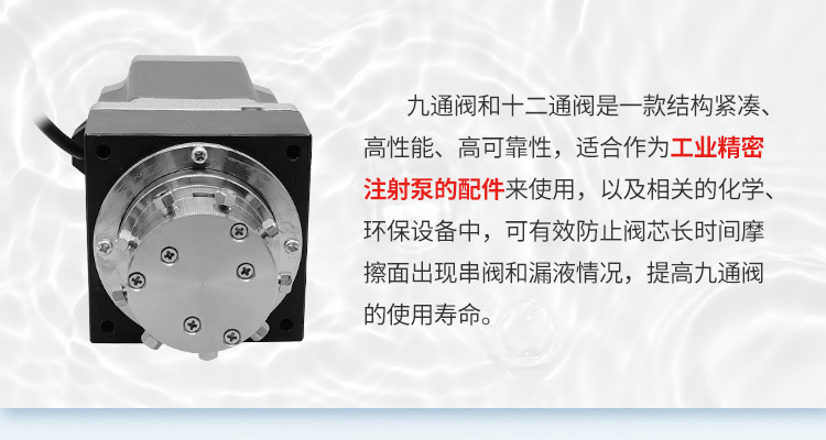 水質(zhì)九通閥十二通閥是一款結(jié)構(gòu)緊湊、高性能、高可靠性的閥門,是水質(zhì)在線監(jiān)測(cè)設(shè)備的配件,適合作為工業(yè)精密注射泵的配件來使用,以及相關(guān)的化學(xué)、環(huán)保設(shè)備中,可有效防止閥芯長(zhǎng)時(shí)間摩擦面出現(xiàn)串閥和漏液情況,提高水質(zhì)九通閥的使用壽命。閥體內(nèi)采用三氟材質(zhì),外殼采用304不銹鋼材質(zhì),具有耐腐蝕性、化學(xué)穩(wěn)定性、阻氣性、耐候性等,耐高溫可達(dá)80度。