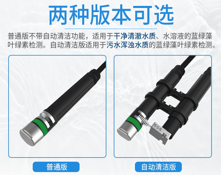 ?葉綠素/藍綠藻分析儀能夠用于檢測自來水、水源地、觀景水等各種水體中的藍藻葉綠素濃度及總?cè)~綠素濃度。葉綠素/藍綠藻水質(zhì)檢測儀分析快速、操作簡便、測量準確度高,能夠?qū)崿F(xiàn)水質(zhì)實時監(jiān)測。葉綠素/藍綠水質(zhì)檢測儀無需制備樣品,直接浸入水中即可進行在線監(jiān)測。葉綠素/藍綠藻水質(zhì)檢測儀有兩種版本的檢測儀供選擇。普通版不帶自動清潔功能,適用于干凈清澈水質(zhì)、水溶液的藍綠藻、葉綠素檢測。自動清潔版適用于污水渾濁水質(zhì)的藍綠藻葉綠素檢測。