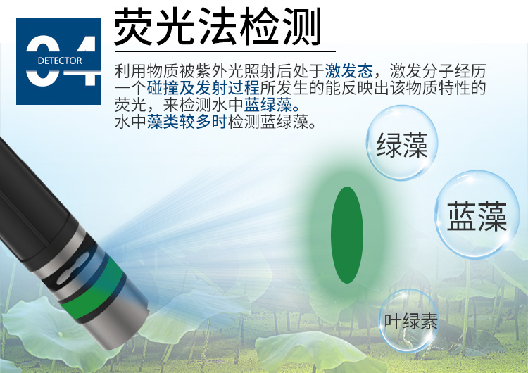 5、熒光法檢測:利用物質(zhì)被紫外光照射后處于激發(fā)態(tài),激發(fā)分子經(jīng)歷一個碰撞及發(fā)射過程所發(fā)生的能反映出該物質(zhì)特性的熒光,來檢測水中藍綠藻。水中藻類較多時檢測藍綠藻。