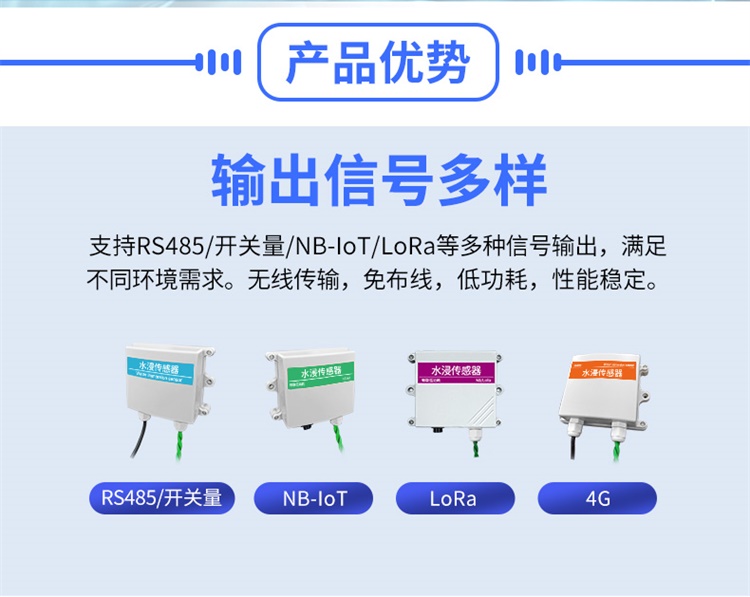 1、水浸傳感器輸出信號多樣,支持RS485/開關(guān)量/NB-IoT/LoRa等多種信號輸出,滿足不同環(huán)境需求。無線傳輸,免布線,低功耗,性能穩(wěn)定。