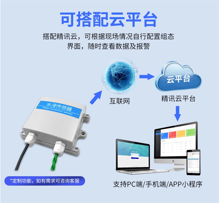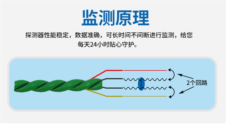 4、高靈敏觸水即報,漏水繩用于檢測傳導性液體滲漏,通過產(chǎn)品信號線的連接,一旦檢測到電線沿線的任何位置有液體為侵入,立即啟動報警功能,云平臺隨時查看數(shù)據(jù)。