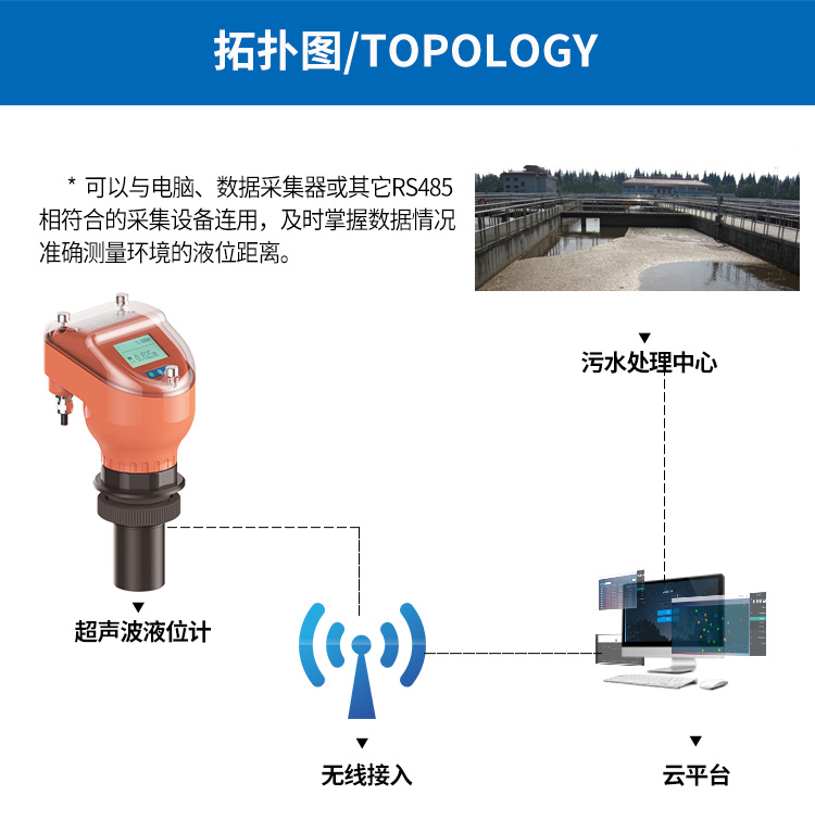 2、清水水位測量:江河湖泊水位及路面積水測量,需求十分普遍。液位數(shù)據(jù)不僅要可靠,還能聯(lián)網(wǎng)上傳便于實時監(jiān)控,超聲波液位具有RS485功能有效滿足您的需求。