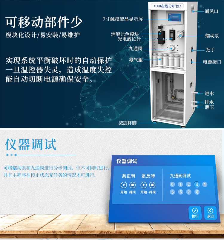 3、自動(dòng)檢測(cè)自動(dòng)清洗:國(guó)標(biāo)法水質(zhì)在線分析儀可自動(dòng)清洗采樣管道、計(jì)量單位、消解反應(yīng)單位、測(cè)量單元的管線。