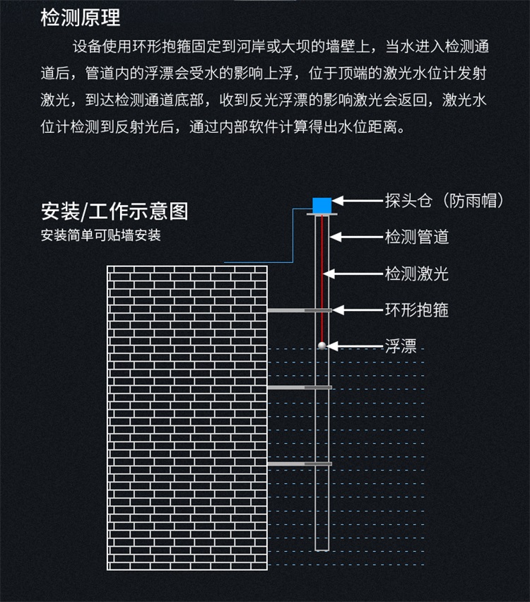 浮球激光水位計使用環(huán)形抱箍固定到河岸或大壩的墻壁上,當水進入檢測通道后,管道內(nèi)的浮漂會受水的影響上浮,位于頂端的激光水位計發(fā)射激光,到達檢測通道底部,收到反光浮漂的影響激光會返回,激光水位計檢測到反射光后,通過內(nèi)部軟件計算得出水位距離。
